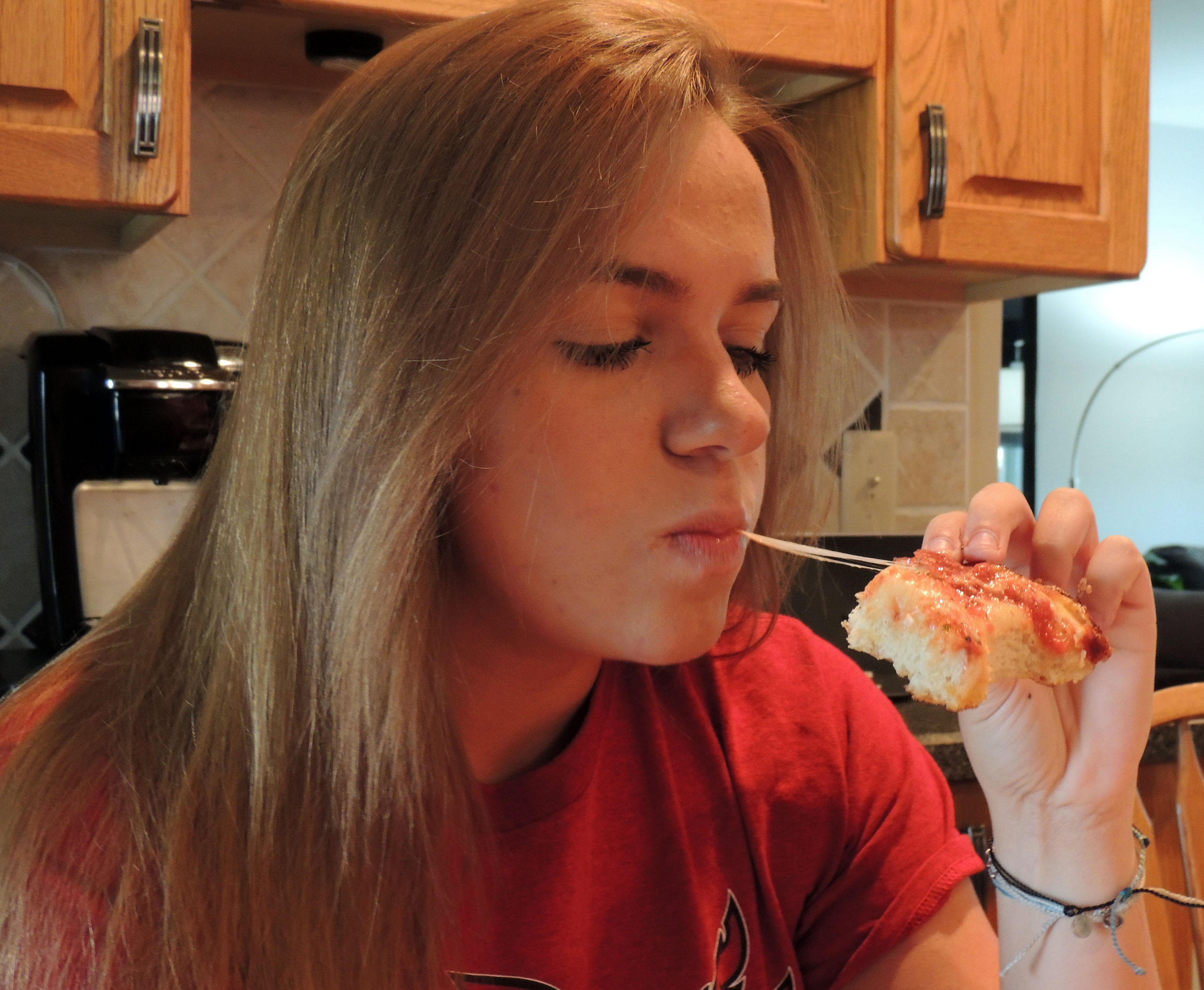 Jet’s Pizza is offering curbside pickup for people, like Lexi Madak, to enjoy a slice!